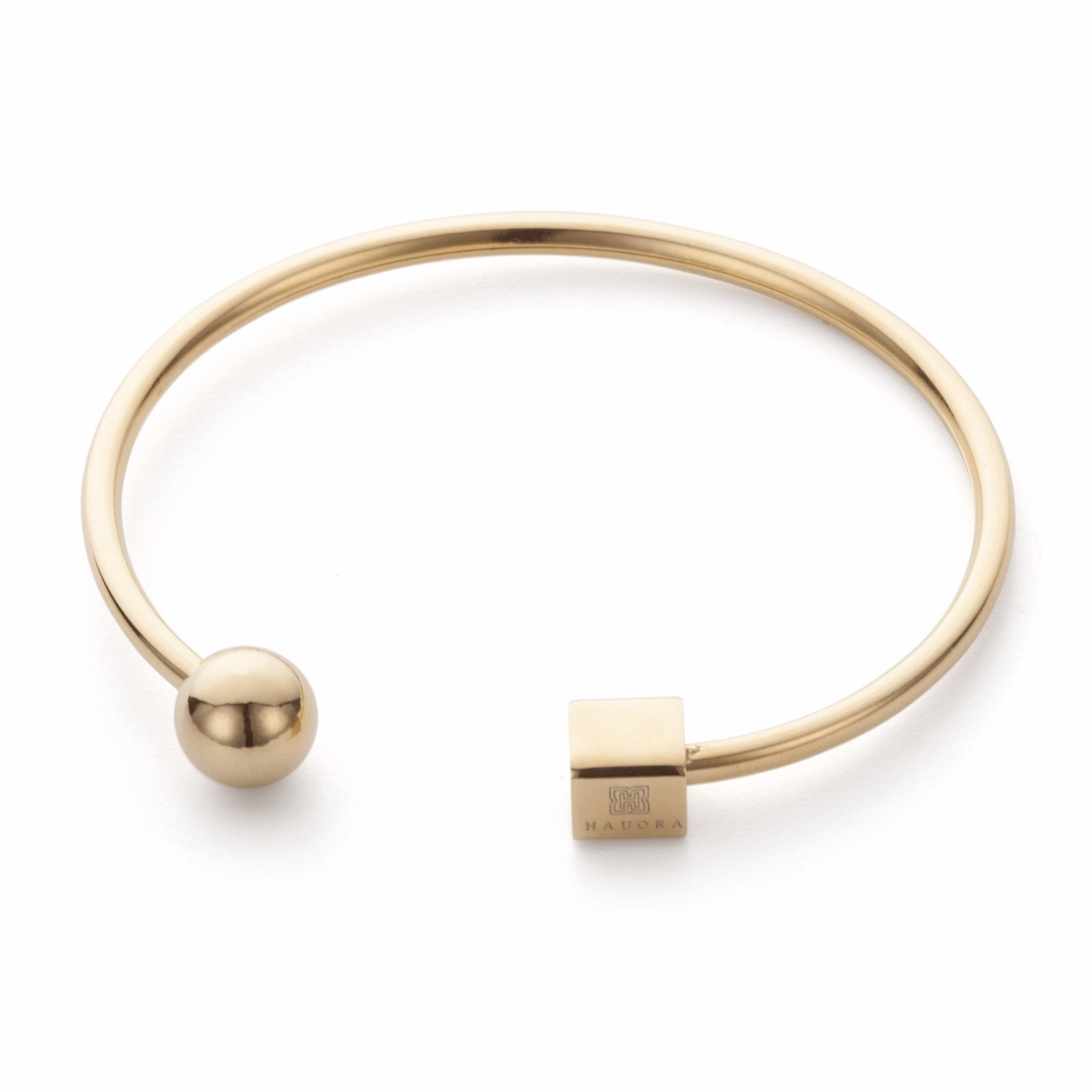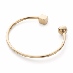 • Gold plated cuff bracelet, with one cube and a sphere finish on the ends.