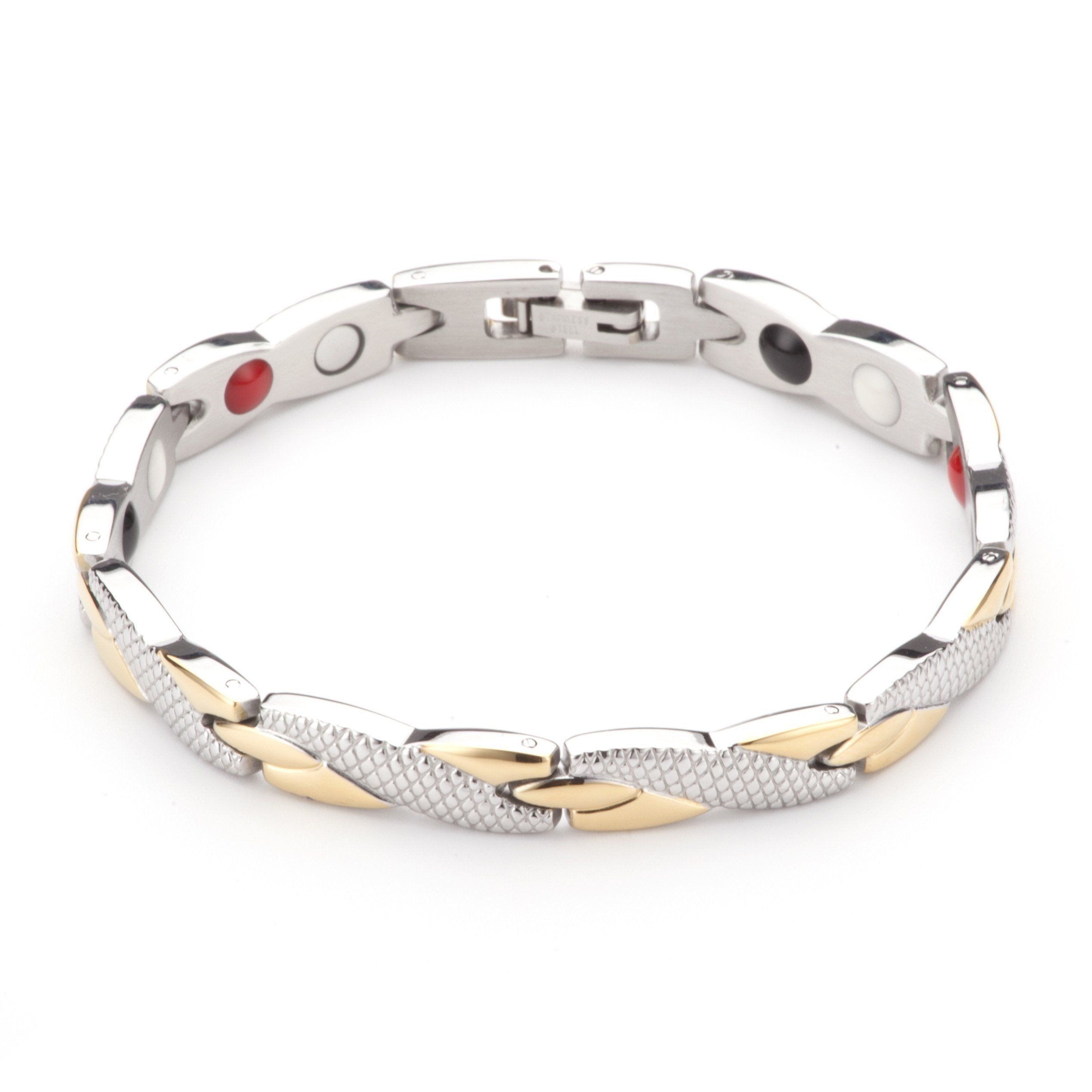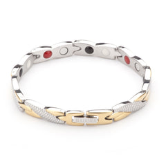 - Gold plated and stainless steel (Health) bracelet, with X links finish and embedded with magnets, negative ions, germanium and far infrared red stones to boost your health.