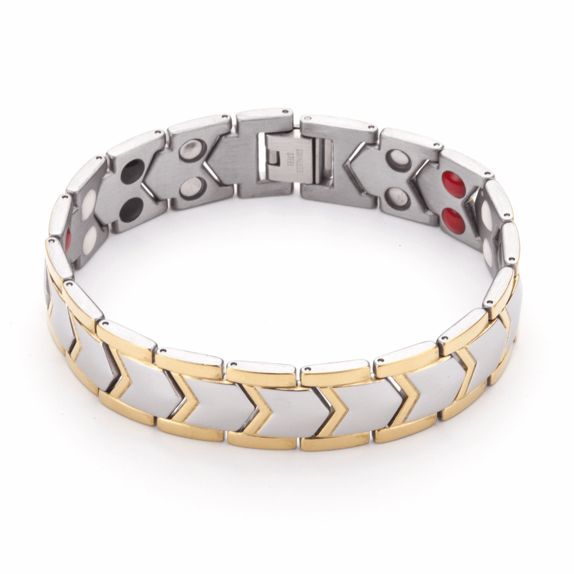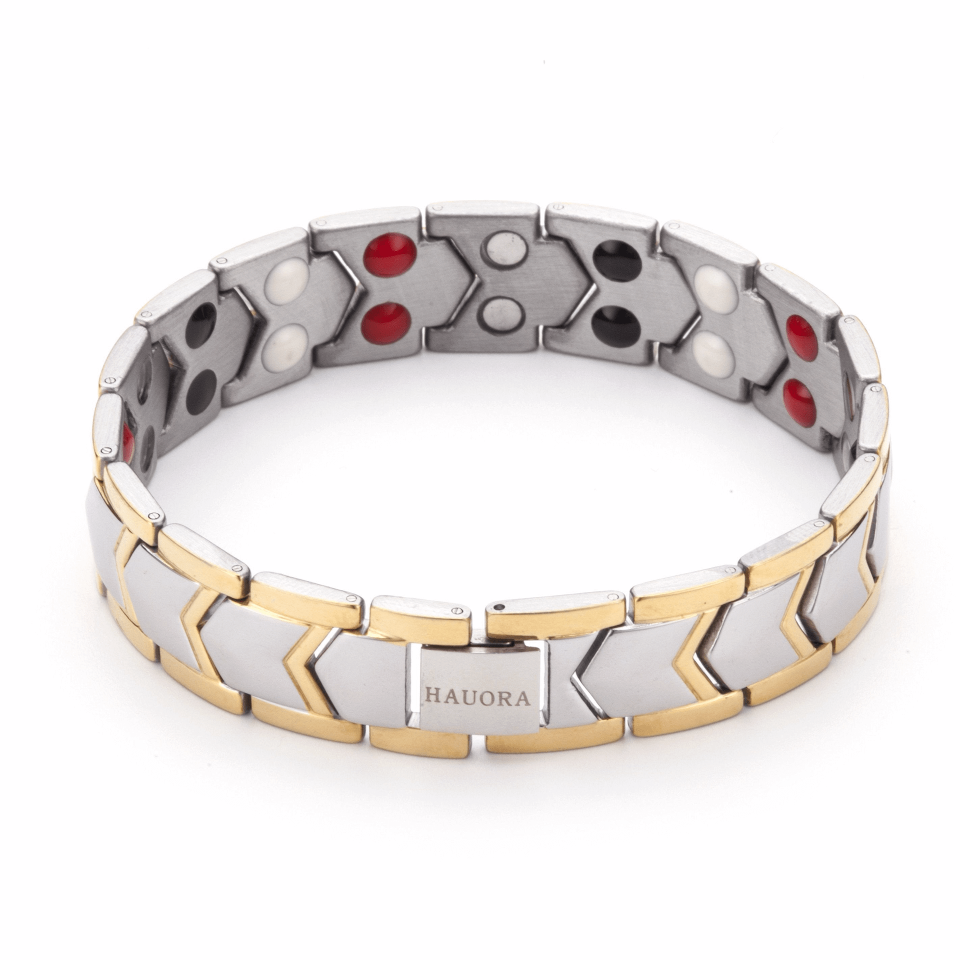 Our magnificent gold plated and stainless steel Hauora (health) range bracelet, with arrow links finish and embedded with 2 rows of magnets, negative ions, germanium and far infrared red stones to boost your health, while ensuring you look stylish. The magnets offer improved blood flow. Negative ions offer increased energy levels. Germanium is known to aid fatigue, by providiing a natural body balance. Far infared stones have been proven to promote cell growth and your metabolism.